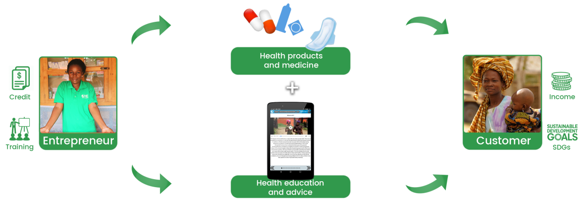 Through comprehensive training, CHEs develop skills in healthcare delivery, inventory management, and business operations. Each entrepreneur is provided with a smartphone preloaded with telehealth applications, educational content, and digital tools for product ordering. CHEs also receive an initial starter kit of essential health products on credit, ensuring they can start their business with minimal risk.
