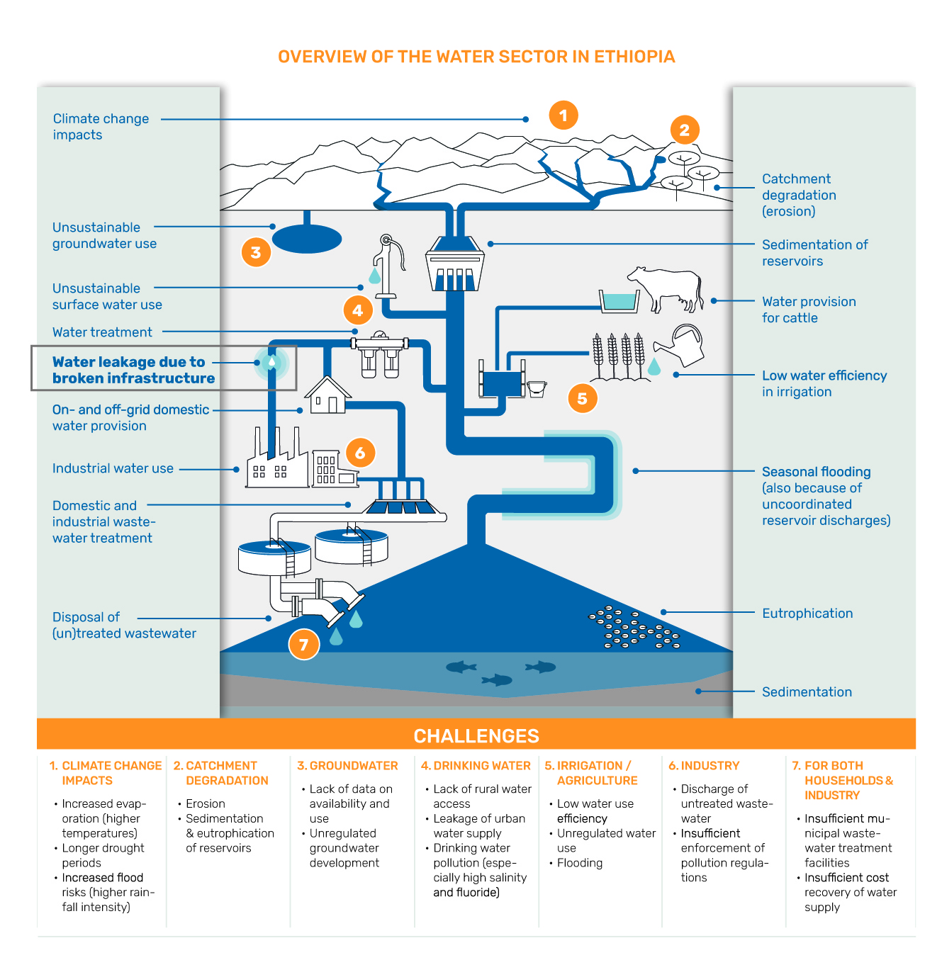 Ethiopia faces big water management challenges. Old infrastructure, inefficient systems, and recurrent droughts significantly strain water resources, leading to severe shortages and compromising the quality of available water. Rapid urbanisation and population growth further aggravate these issues, as water demand keeps increasing while existing systems struggle to cope with underinvestment and pressure on water resources due to climate change.